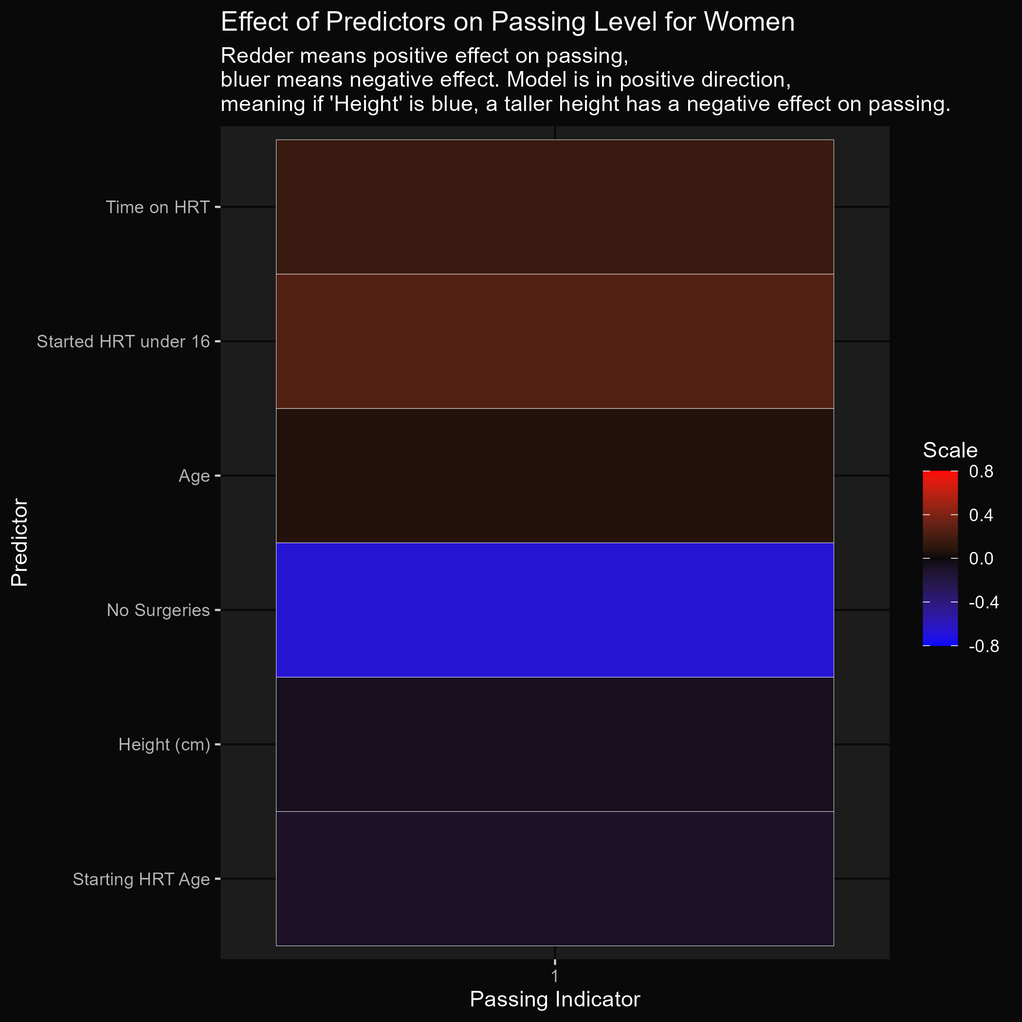 It seems that for Men, the biggest contributing factor to passing is time on HRT. Whereas for Women, it’s whether you are a youngshit, or have surgeries.