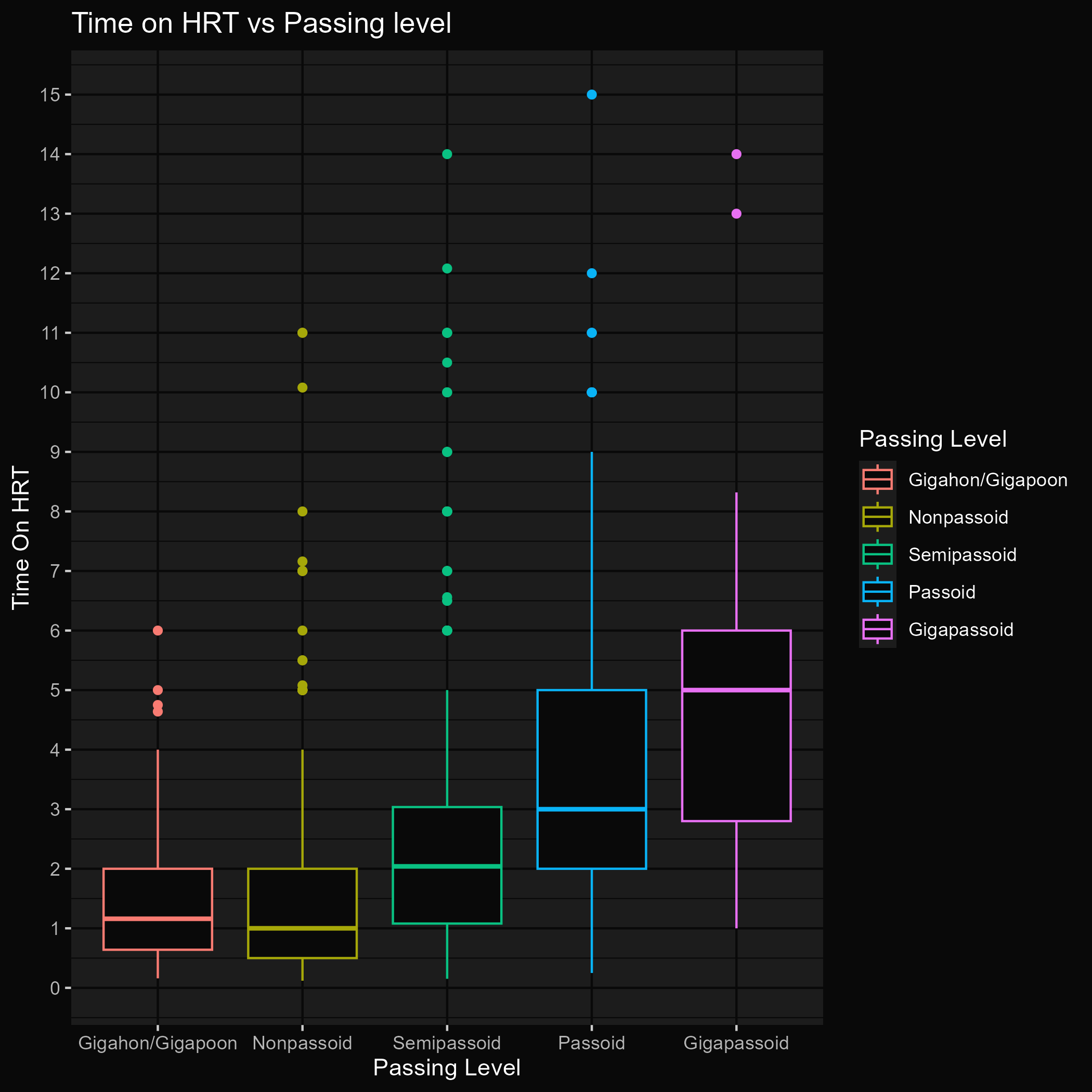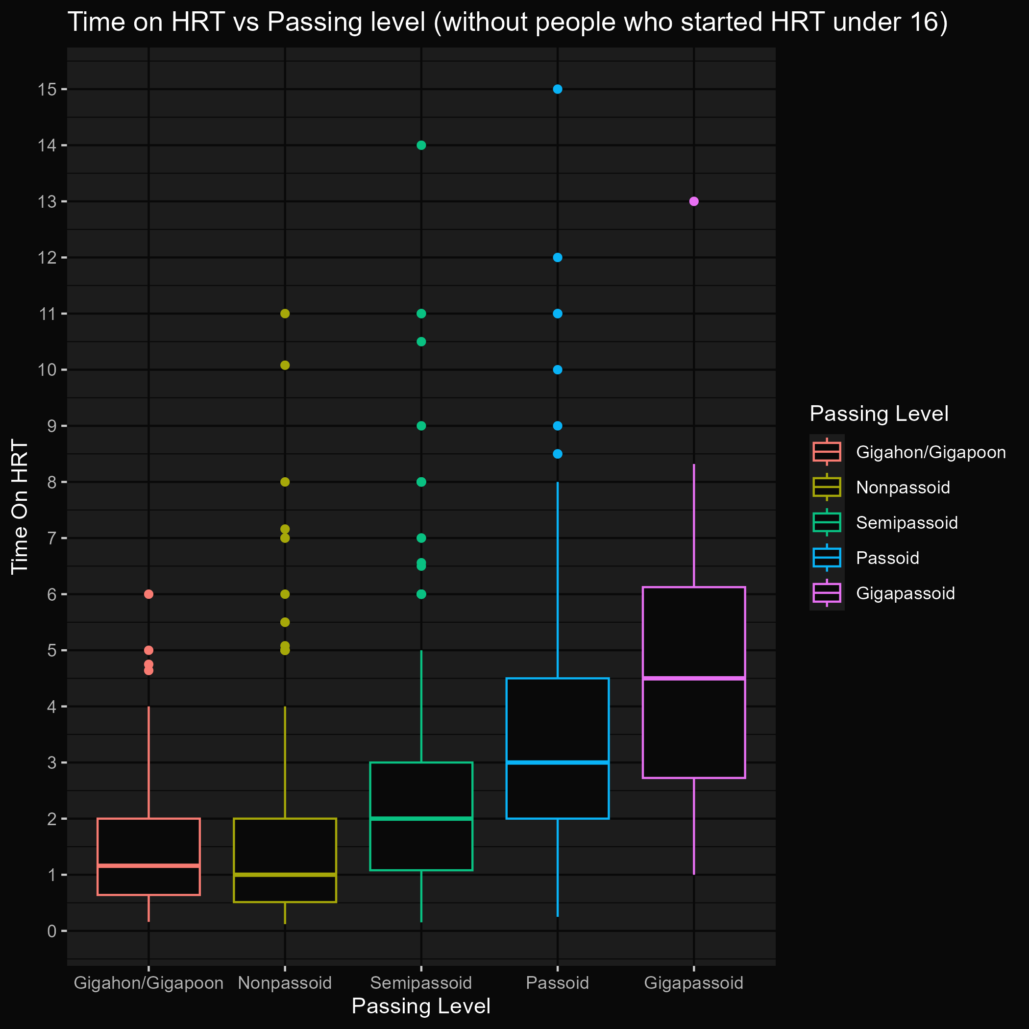 This may seem counterintuitive at first. However, it makes sense that removing youngshits, who having been on HRT for sometimes 6-15 years, would bring the 3rd quartile down for HRT time for Passoids.